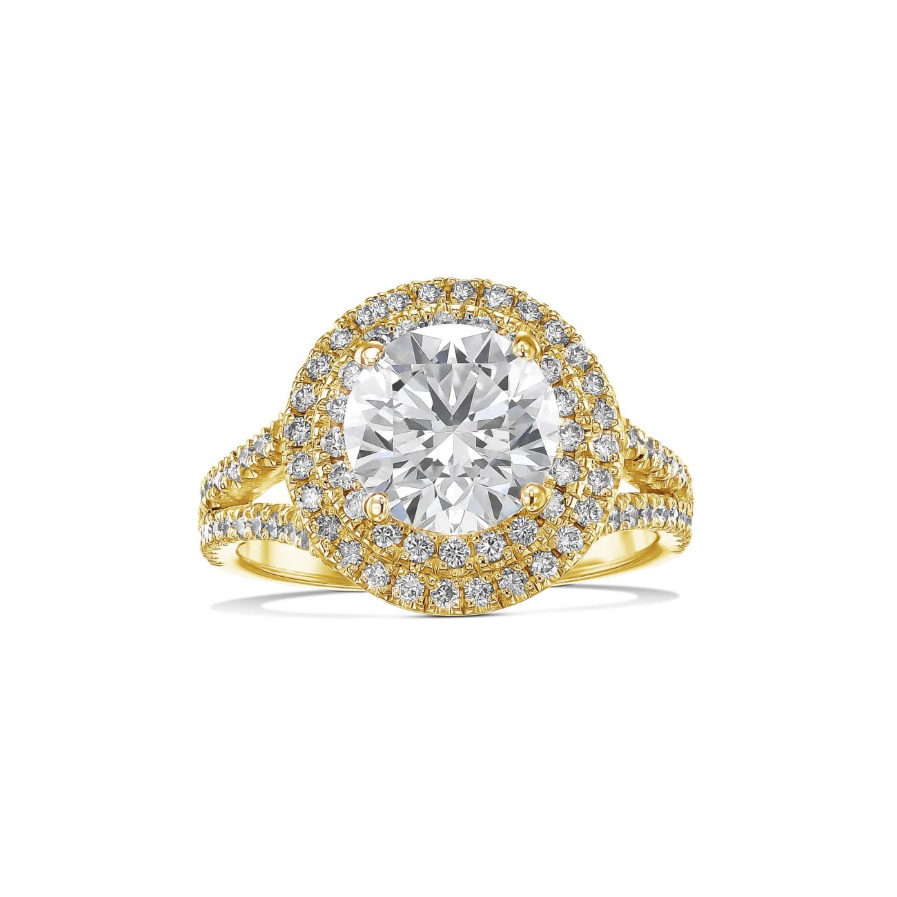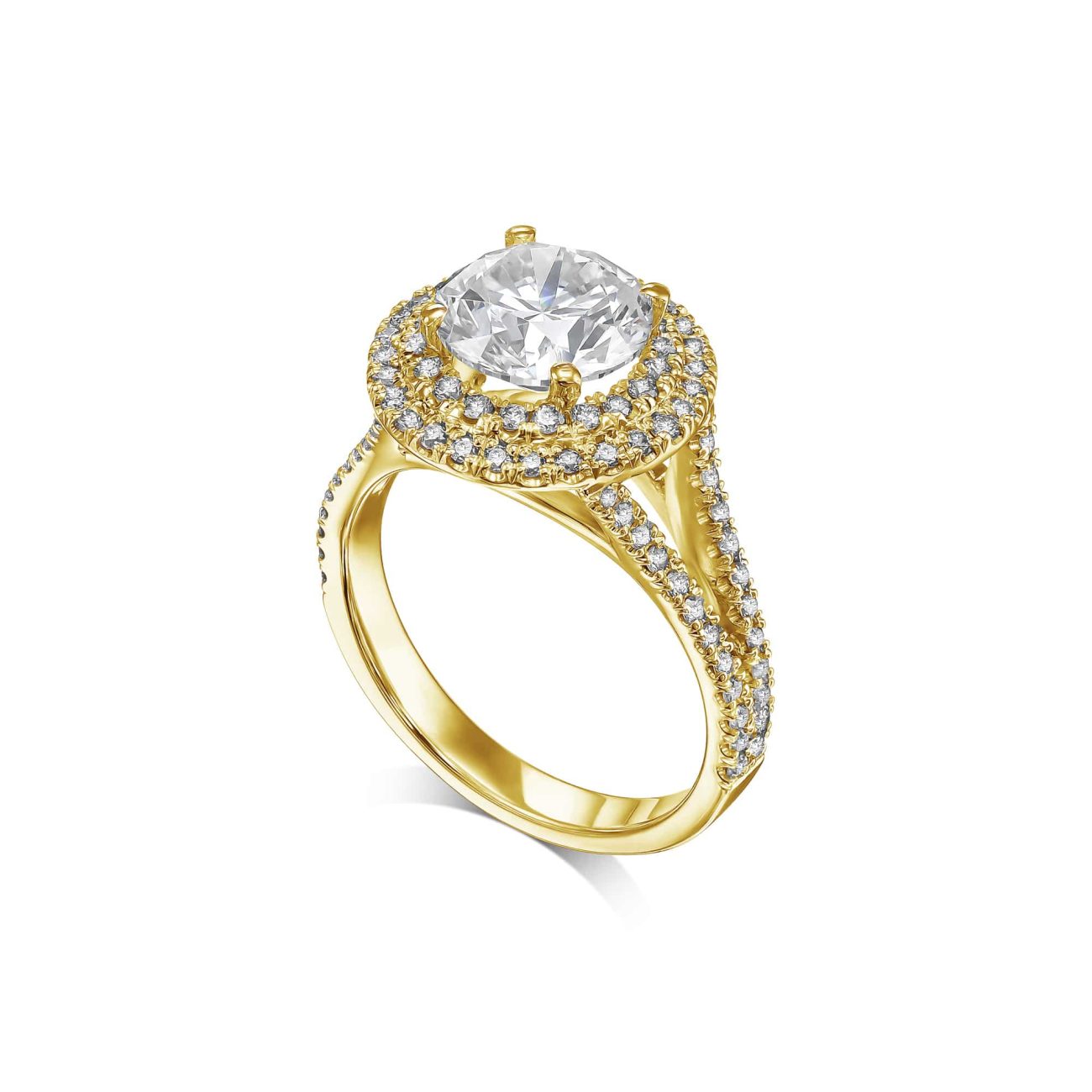 טבעת אירוסין משובצת יהלום מרכזי עגול, היילו כפול מסביבו ו2 שורות יהלומים משובצים על הטבעת עצמה