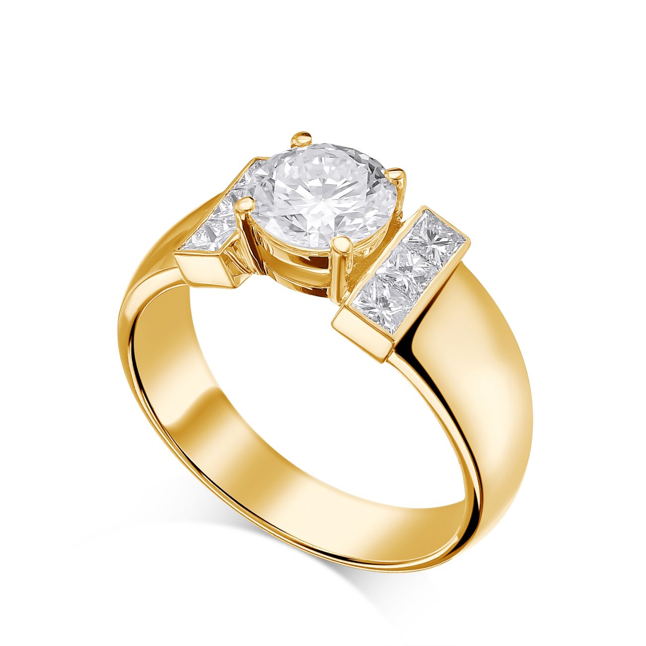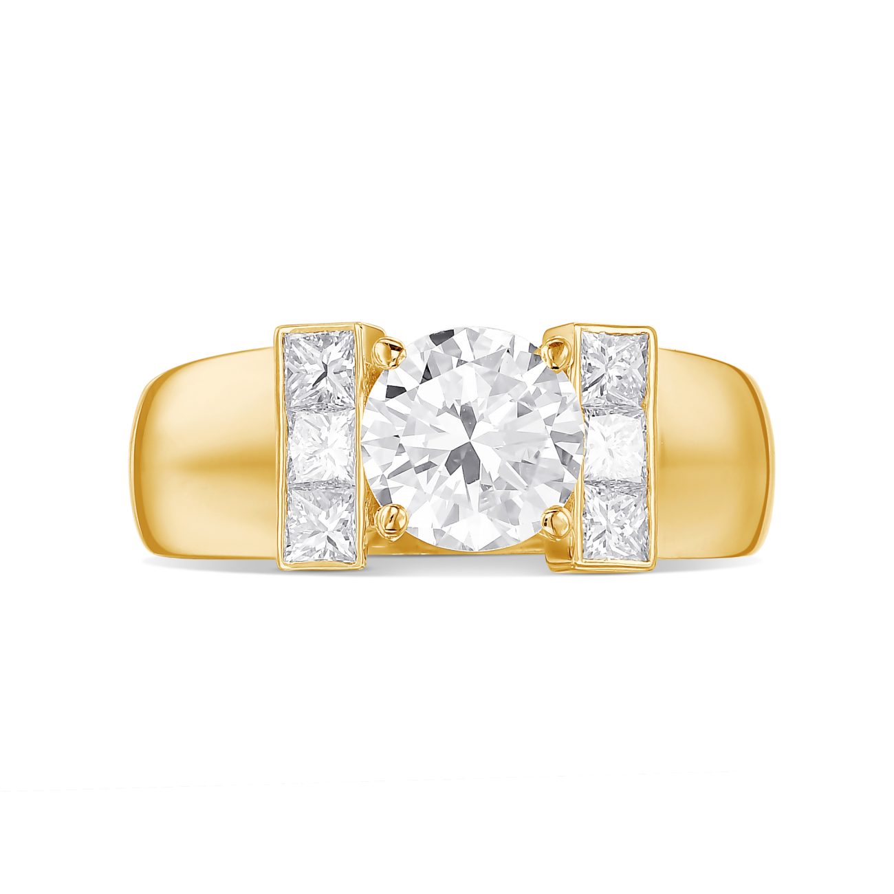 טבעת אירוסין מרשימה משובצת יהלום עגול מרכזי ו6 יהלומי צד בחיתוך פרינסס