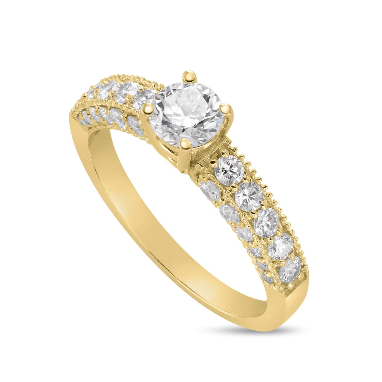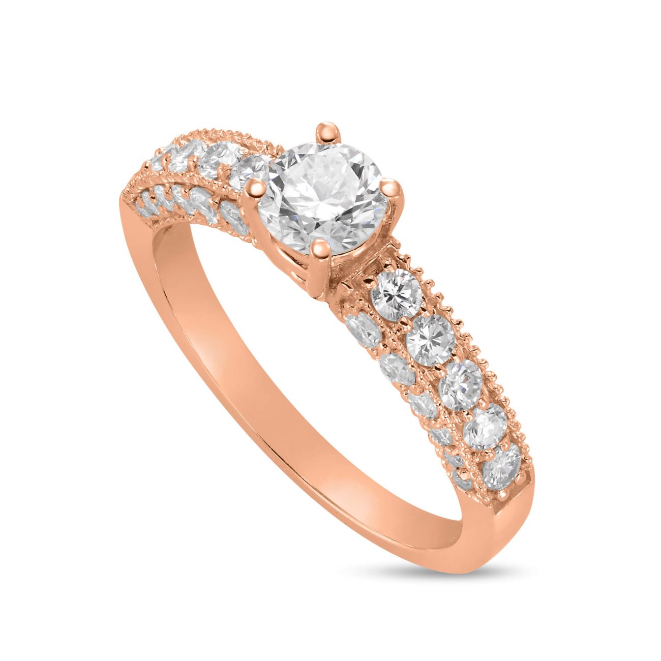 הטבעת משובצת ביהלום מרכזי עגול ו3 שורות של יהלומים בצידי הטבעת מ3 כיוונים שונים (שורה אחת לאורכה של הטבעת ו2 שורות נוספות מצדדיה)