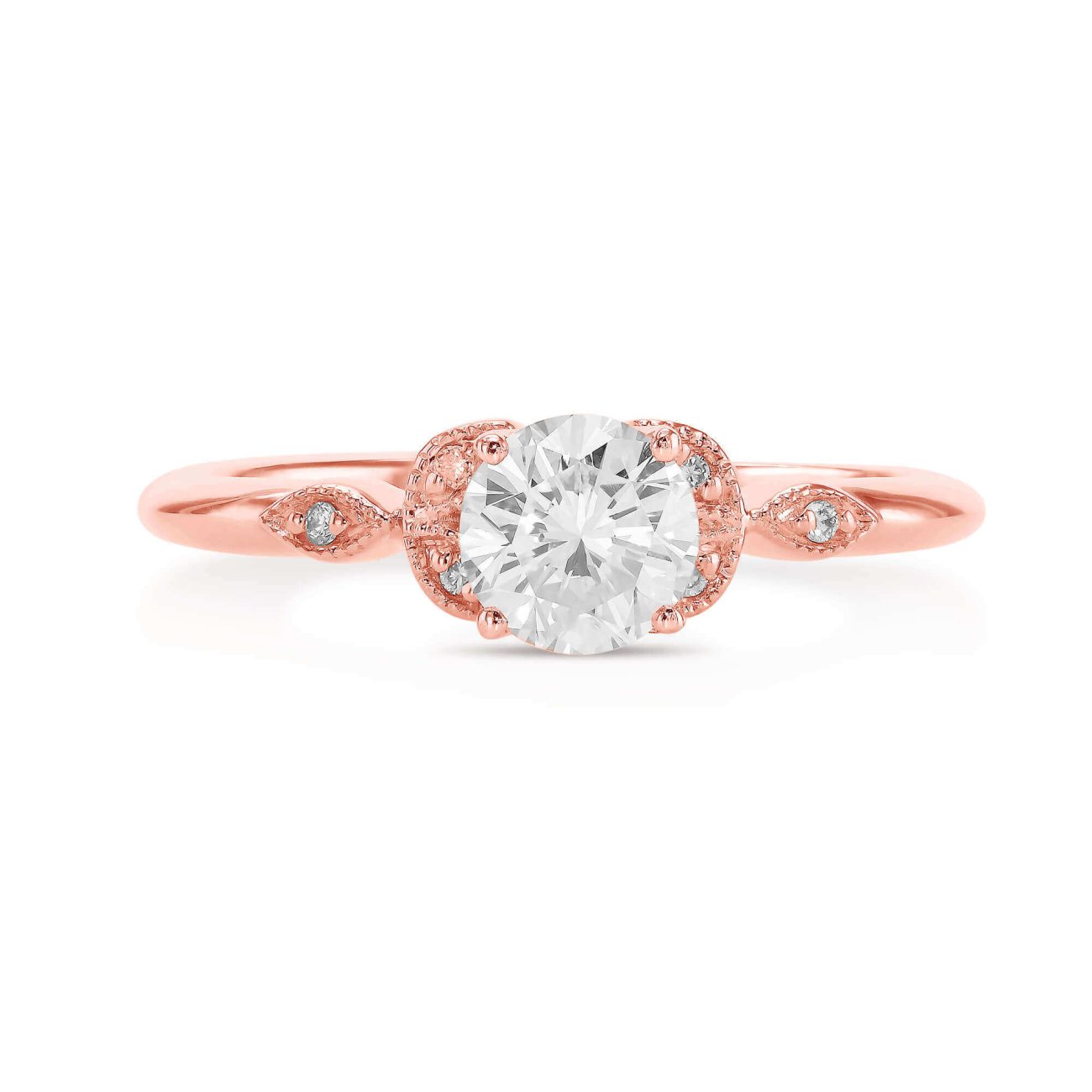 טבעת בעיצוב ווינטג' ייחודי שלנו, משובצת יהלום מרכזי עגול ומצדדיו עיטורים ויהלומי צד במשקל כולל של כ-0.4 קראט