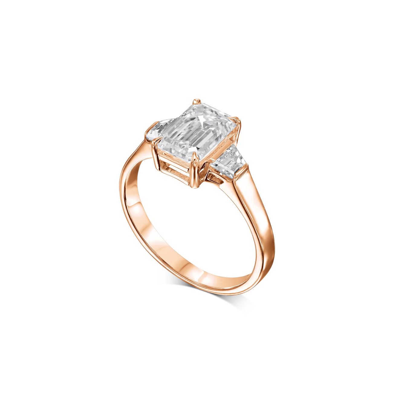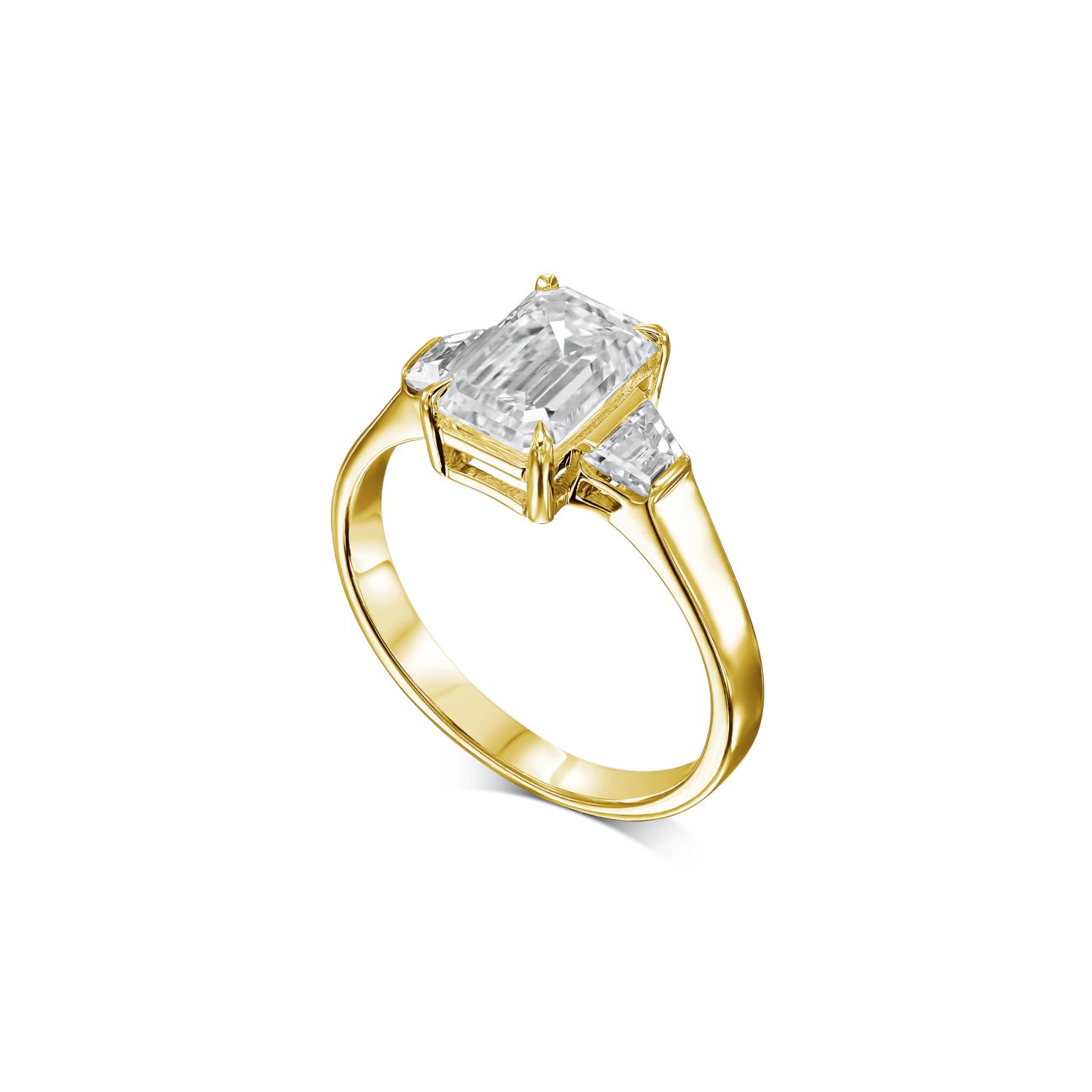 הטבעת משובצת ביהלום מרכזי בחיתוך אמרלד (מלבן) ויהלומי צד בצורת טרפזים מהממים