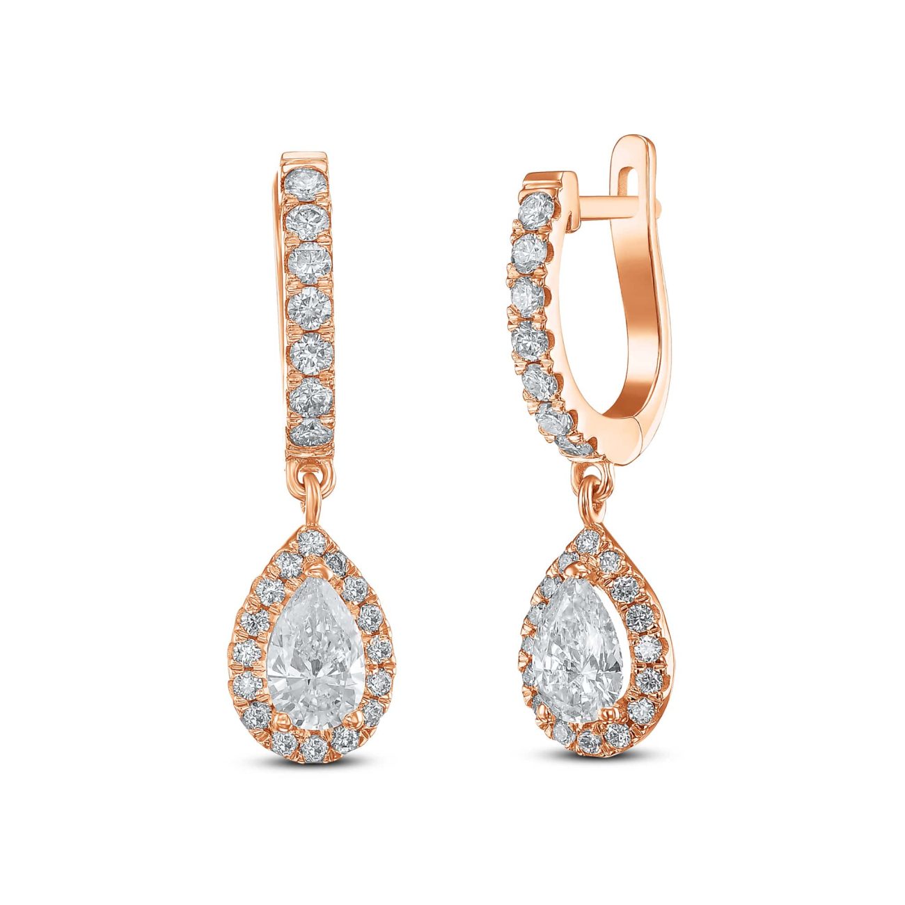 עגילי סוליטר משובצים טיפות עם האלו, העגילים מגיעים במספר רב של גדלים ובכל צבעי הזהב. ניתן לשנות גם את צורת היהלומים המרכזיים ואת גודל יהלומי הצד בעיצוב אישי.